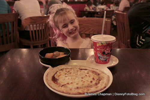 But you didn’t think I’d let you get past a restaurant post without food photos did you? The following tantalizing tidbits come courtesy of James Chapman, who runs DisneyFotoBlog.com. James visited Mama’s with his little princess, Chloe, who you get to see very patiently showing off her kids’ pizza!