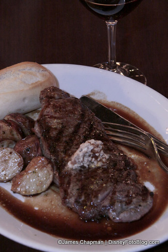 I really enjoyed my meal there back in ’05. In fact, I wrote in my trip notes that it was my “favorite meal of the trip” (despite the fact that I did feel a little uncomfortable since I was the only solo diner; I think all the families were doing the Fantasmic Dinner Package). I liked the Italian music playing in the background and the little twinkly lights everywhere. My waiter rocked. He was very efficient. I had the Charred Sirloin Steak over roasted red pepper polenta, grilled asparagus, with gorgonzola butter and red wine reduction–Oh. My. God. Was it GOOD. I also had a great cocktail called the Italian surfer that had Amaretto, Malibu Rum, and assorted fruit juices. Delish. I’d go back in a heartbeat.