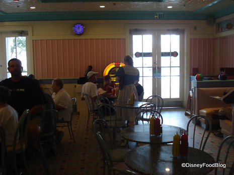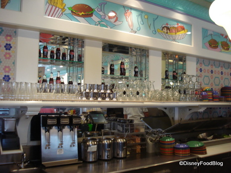 Beaches and Cream is located right next to Stormalong Bay between the Beach Club and Yacht Club Resorts. It’s styled as a mid-century shoreline soda shop, complete with a creamy, salt-water-taffy color scheme; beach balls adorning the booths; a counter lining two walls; a big ol’ jukebox; and white wrought iron tables.