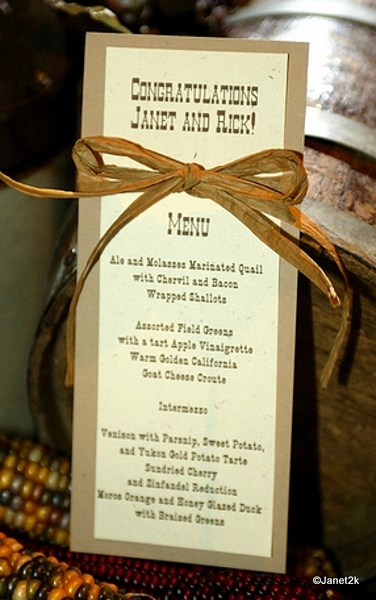 According to Janet, “We kept the table decorations simple: small wooden barrels, ceramic moonshine jugs, rope lariats, driftwood frames, bundles of corn, bundles of twigs, bundles of leaves, bales of hay, and small hurricane lamps.”