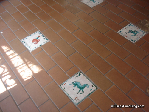 There is shelving on the wall holding salt, sugar, flour, and spices; iron candelabras hanging from the wooden ceiling; and painted tiles set into the brickwork on the bakery floor.