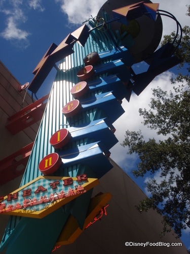 I wanted to give you more construction pics for today, but DH said you’d prefer some food porn, so here we go! We’re headed to Disney’s Hollywood Studios and the Sci-Fi Dine-In! Sci-Fi Dine-in in Disney’s Hollywood Studios is a quintessential Disney experience. It’s imagineering and restauranteur-ing at its collaborative best: drive-in movies and good eats mixed together on a big ol’ sound stage in the middle of a theme park! The next time you bring someone new to Disney World and want to knock their socks off with something they’ve never seen before, book a reservation here. Atmosphere You’ll enter through what looks like a movie theater entrance, but find yourself here, in a soundstage-esque reservation area. The floors are concrete and you’re surrounded by movie posters for mid-century b-movies: Attack of the 50-ft Woman, The Blob, etc… .