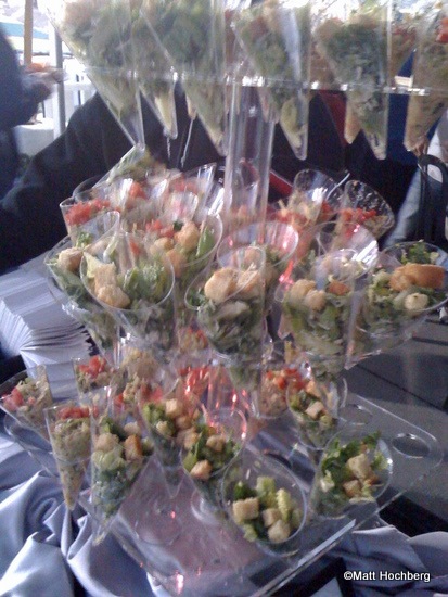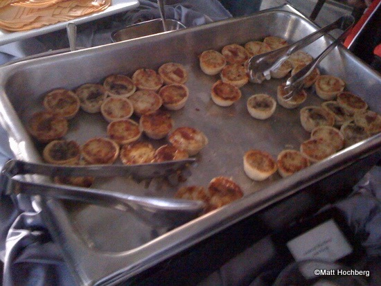 Yeah, I was surprised to see those salad cones there. One of the salads was a Caesar. The other was a chopped salad that had Turkey and what tasted like a creamy avocado dressing. It was delicious. I put a couple of those “mini quiches” on my plate and was surprised to find when I bit into one that they were actually tiny deep dish pizzas! Some had pepperoni and some had mushroom.