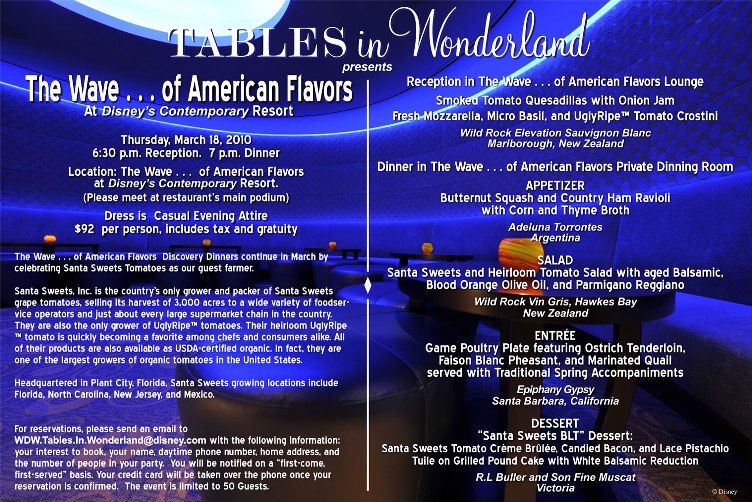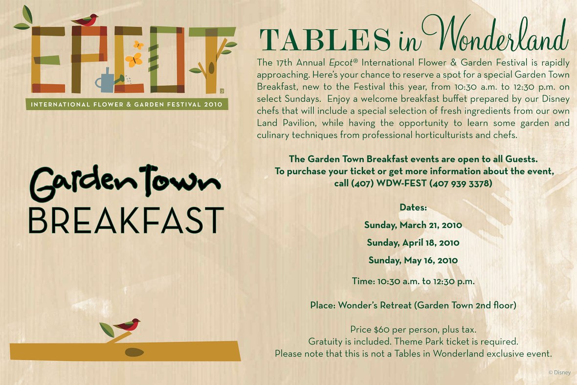 This month’s Tables in Wonderland events include another Wave Dinner on March 18th, highlighting Florida’s own Santa Sweets, Inc.; and a very cool Raglan Road meet-the-Chef event (hosted by our favorite celebrity Master Chef, Kevin Dundon) scheduled for March 30th. This month’s Tables in Wonderland email also featured the new Garden Town Breakfast highlight from the Epcot Flower and Garden Festival; all Disney guests are welcome to register for this.