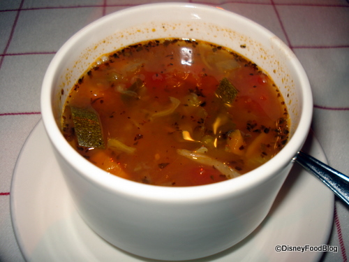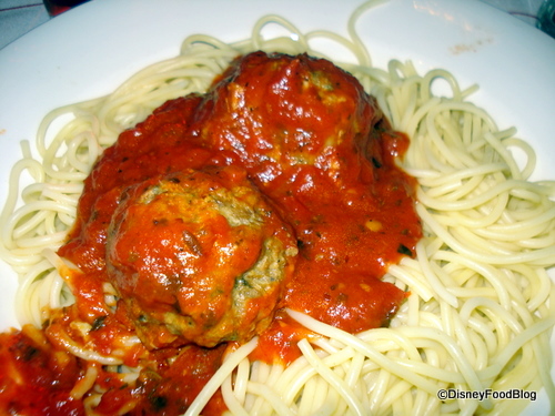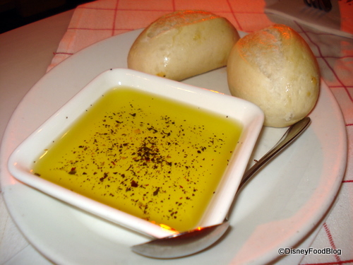On the night we went, we chose some of our favorite “Disney-Italian-Food-Restaurant” dishes — Spaghetti and Meatballs (of course) and Chicken Parmigiana (though, in retrospect, I wish I’d ordered steak! It looked delicious when I saw it brought to another table!). To start, we ordered a caesar salad and a bowl of minestrone soup. Bread rolls with olive oil were also brought out prior to the meal.