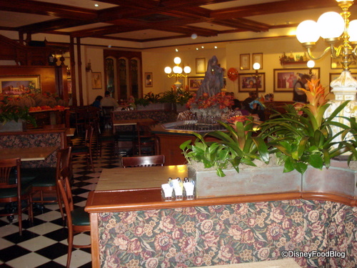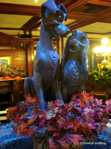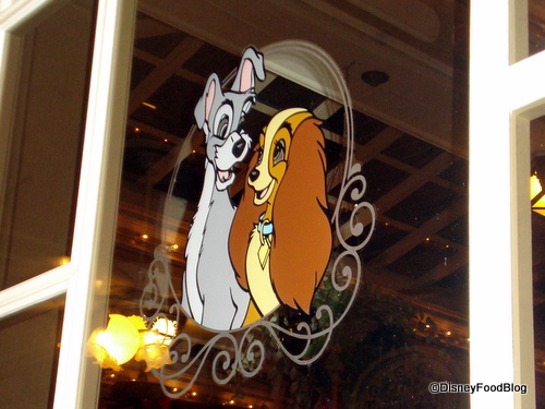 The restaurant is located in the Exposition Hall right next to Disney World’s Train Station. You’ll remember from Disney’s Lady and the Tramp the restaurant upon which Tony’s is styled — in the alley behind it was where Lady and the Tramp shared their famous spaghetti dinner! And you’ll find several Lady and the Tramp references throughout the restaurant. (Check out this post from SamLand’s Disney Adventures for one very special tie-in!)