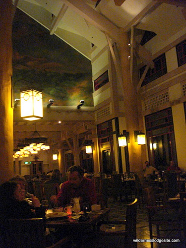 Finally, my chance would come in January 2010, due to my dear fiance’s parents, who have rekindled their love for the establishment. It was the last day of our vacation when we boarded the boat from Magic Kingdom. The hull cut its way through inky black waters, past the lights of the Contemporary, headed to the dock of Wilderness Lodge. We reached our destination, and the long wooden dock, flanked with intricate lanterns that called us into our Pacific Northwest inspired destination.