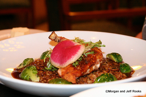 The Spinach Salad was light and fresh, and I was delighted by the large pinkish vegetable that topped its presentation. I learned that it was a slice of watermelon radish. Milder than it’s common garden cousin, it had a slight sweetness with a peppery finish. It perfectly complimented the sweet-tang of the pickled onions and the mustard vinaigrette against the mild spinach.
