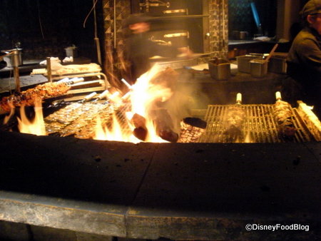 Your “cousin” host will take you on a tiny tour of the restaurant, passing by the open kitchen and an array of “sample drinks,” then by the open fire pit where Cast Members are grilling long skewers of meat and shrimp, and then on to your table.