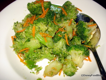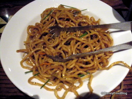Just as you’ve dug into your salad, large plates of lo mein noodles with vegetables and teriyaki sauce, stir-fried vegetables (usually mostly broccoli), pork dumplings drizzled with a sweet and sour sauce, and honey-coriander chicken wings show up on your table. These are some of the best chicken wings on Disney property (true…there aren’t many chicken wings on Disney property, but these are still pretty good).
