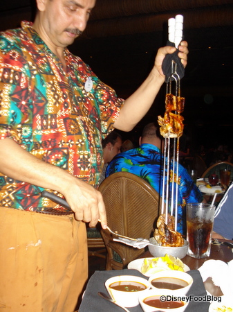 Finally, your cousins come by with the main event — grilled meats stacked high on skewers. This is a show in and of itself! One meat will come to your table at a time: mesquite grilled turkey, asian BBQ pork loin, marinated sirloin steak, and spicy peel n eat shrimp. (Note: these are on the menu at “press time;” Disney switches these up often.) The meats are accompanied by three sauces: peanut, spicy mustard, and sweet n sour. Your server will recommend which sauce to try with which meat.