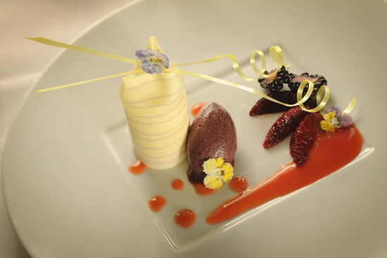 White Chocolate and Meyer Lemon Purse with Blackberry-Violet Sherbet