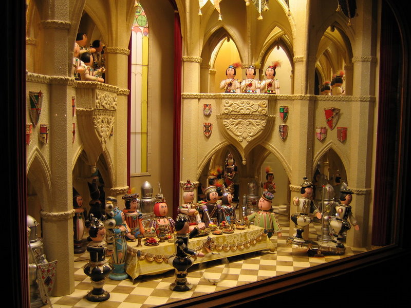 Clearly, what we’re looking at here is a Royal Feast: the King is seated next to his Queen and Royal guests, servants bustle about behind the table, and an entertainer is rolling a hoop in front of the Royal party. And that’s not all — Knights in Armor guard the table with glistening, bejeweled shields; musicians stand in the balconies ready to entertain at a moment’s notice; Royal crests bedeck the walls; and a huge stained glass window completes the scene.