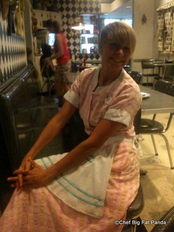 Our server, Mandy, realized we were Disney fanatics and not easily rattled. When we each had our cell phones out at the same time, she yelled “put those walkie talkies away!” She was not Disney-nice about it either. Like I said, it’s the 1950’s, and she was our big sister.