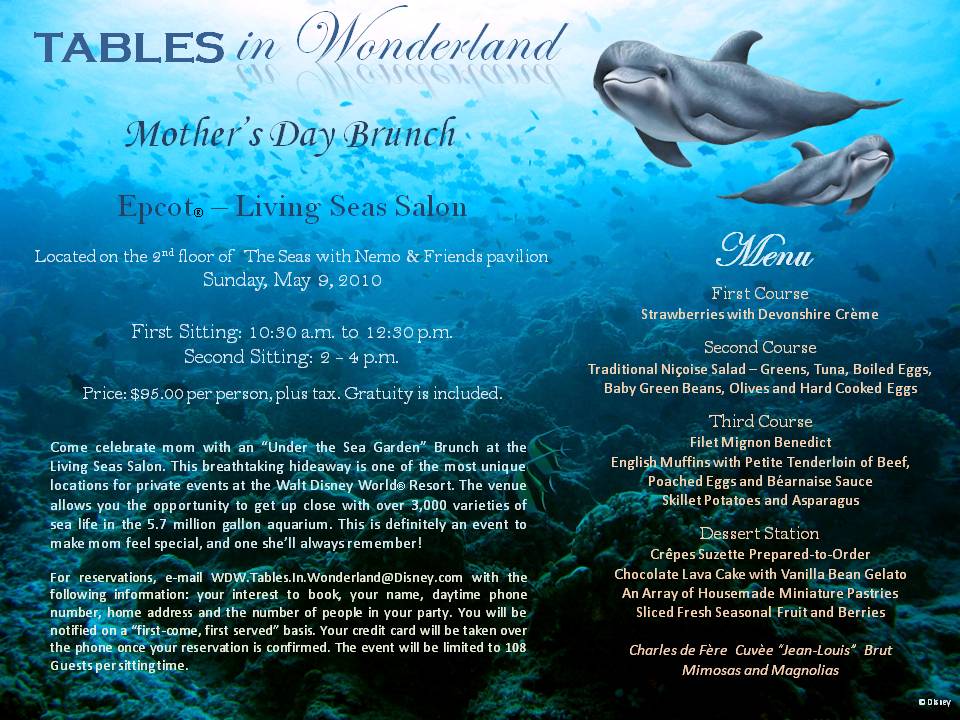 Let me be the first to say it; I think someone at WDW has lost their mind! What happened to the good ol’ days when the brunch for Mother’s Day was just, a very reasonable $50/pp or so? Each year it has continued to go up, then last year, if I’m not mistaken they skipped it. So this year, they decided to make up for it by charging for two years worth of meals? I love the Mouse, I love the Mother’s Day Brunch, but $400 for my little family? I think I’ll go have a fab-o meal at Victoria and Albert’s, The Brown Derby, or Le Cellier. For that price we can order the whole menu.