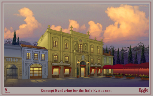 Via Napoli, operated by the Patina Restaurant Group, is coming to Italy in Epcot World Showcase in time for fall 2010. Shown here in a concept rendering, the 300-seat restaurant will feature a menu inspired by the famous pizzerias of southern Italy.