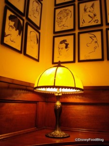 The likeness to the original restaurant is uncanny — the covered entryway, signage, dining room, and even decor are identical to the namesake. And those well-known caricatures grace the walls here just as they do there. (The black and white images are copies, but the gold-framed ones are original!) Even down to the tiny brown derby lampshades, the imagineers have outfitted this place with an eye to detail. (Be sure to click the images to see larger versions!)