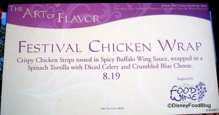 The Festival Chicken Wrap can be found at the Bountiful Valley Farmers Market near Pacific Wharf in Disney’s California Adventure theme park. This item consists of a spinach tortilla filled with Buffalo-sauced chicken tenders, crumbled blue cheese, and diced celery.