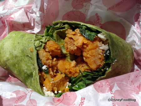 When we received the wrap, it was ice cold and felt like it was taken directly out of the refrigerator. This was really surprising to us, as the description of a “crispy chicken strip” made us think “hot.” The chicken strip was a standard Disney chicken finger doused in Buffalo sauce. It was accompanied by what looked like fresh spinach as well as the promised blue cheese crumbles. We couldn’t find any diced celery in the wrap, so we assumed the spinach was taking its place at this point.
