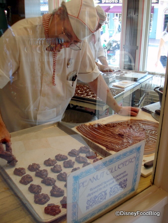 Today, we’re discussing the homemade goodies from the Main Street candy stores at Disney World and Disneyland, which means I get to talk about Disneyland’s Candy Palace! And let me say right up front — this place is all about the homemade! You know they’re famous for their homemade candy canes during the holiday season, but they’re making homemade candy — front-and-center — every single day of the year here.