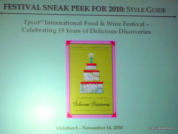 More news is trickling in about the 2010 Epcot Food and Wine Festival! Here are some great pics of the Food and Wine Festival slide presentation given at the D23 Flowers and Fireworks event this past weekend. These were taken and donated by Lori Abramson — Thanks, Lori!