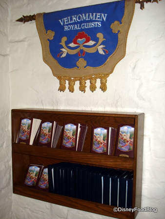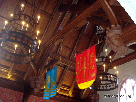 Akershus Restaurant is a royal dining room named for the Norwegian castle that still towers over Oslo Harbor today. And because it is the dining room of your favorite princesses, it has many touches befitting a royal castle: tapestries and thrones line the stone walls, archways lead to several different dining rooms, cinders lie in giant fireplaces, and banners flutter amongst chandeliers on the beamed ceilings.