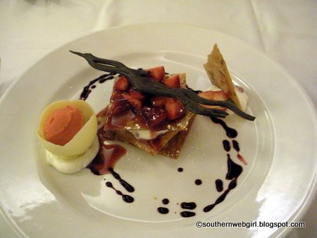I decided on the Marscapone and Meyer lemon cheesecake — whipped cheesecake and Meyer lemon panna cotta with yuzu ice and citrus poached blueberries. Brian decided on the California strawberry Napoleon — orange-rosemary pastry cream, fresh strawberries, almond crunch, and strawberry-champagne sorbet.