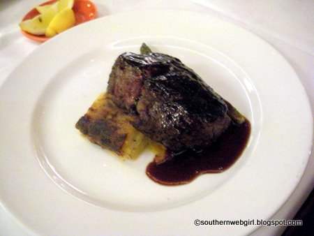 For our main course, I quickly decided on Seared Bison with Sweet Potato, Bacon, Piquillo Pepper Hash, Sweet Onions, and Mustard-Veal Demi. Husband decided on the Oak-Fired Filet of Beef with Tillamook Cheddar Gratin, Zuckerman’s Asparagus, and Teriyaki Barbecue.