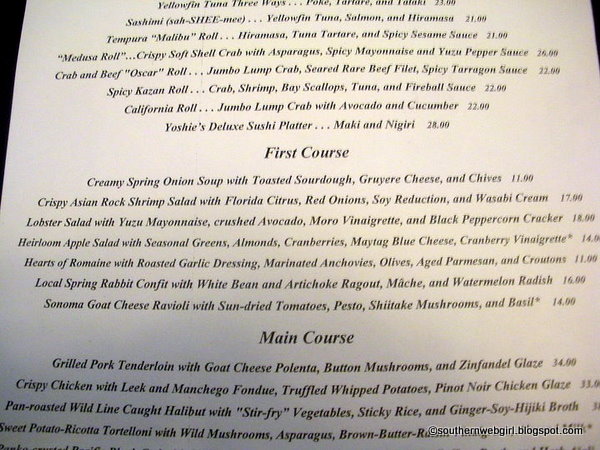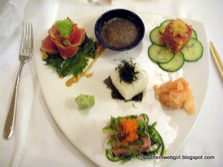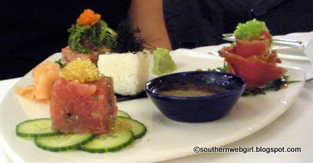 I zoned in pretty quickly on the Yellowfin Tuna Three Ways (Poke, Tartare and Tataki) sushi appetizer. Husband decided on the Crispy Asian Rock Shrimp Salad with Florida Citrus, Red Onions, Soy Reduction, and Wasabi Cream as listed below in the first courses.