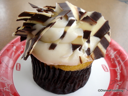 Guys, this Zebra cupcake is massive. Its construction is akin to one of our favorites over at Disney’s Hollywood Studios — the chocolate peanut-butter cupcake — with piles of frosting and chocolate shavings stuck in at odd angles.