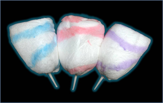 Light-Up Cotton Candy: White cotton candy with a colorful swirl, on an illuminated wand that lights the cotton candy from inside.