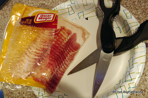 Let’s prepare our Bacon and Vegetables as we will be using them first. How can we finely chop bacon? Let’s face it, bacon is slimy and doesn’t cut very well. It would stick to the blades of a food processor or a chopper. We need to freeze it for a little while — so put the bacon in the freezer until it is almost frozen, or freeze it and allow it to partially thaw. This puts it into a state where we can cut it finely with some good sharp scissors without much hassle. It’s just time consuming. I am open to other suggestions or ideas. You can’t cook it first or use anything like bits that are not fresh. I do have to thank my Mom for the freezing suggestion as I was seriously perplexed at how to finely chop bacon. I was! 🙂