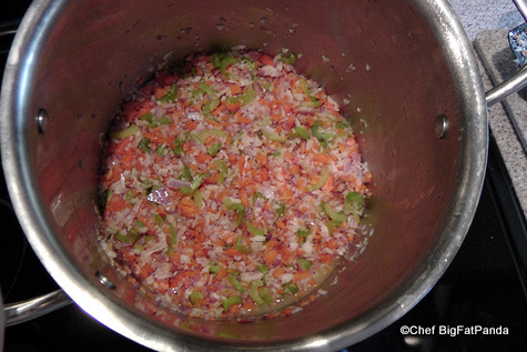2. Add Onion, Celery, and Carrots and cook until onions are translucent and bacon has crisped.