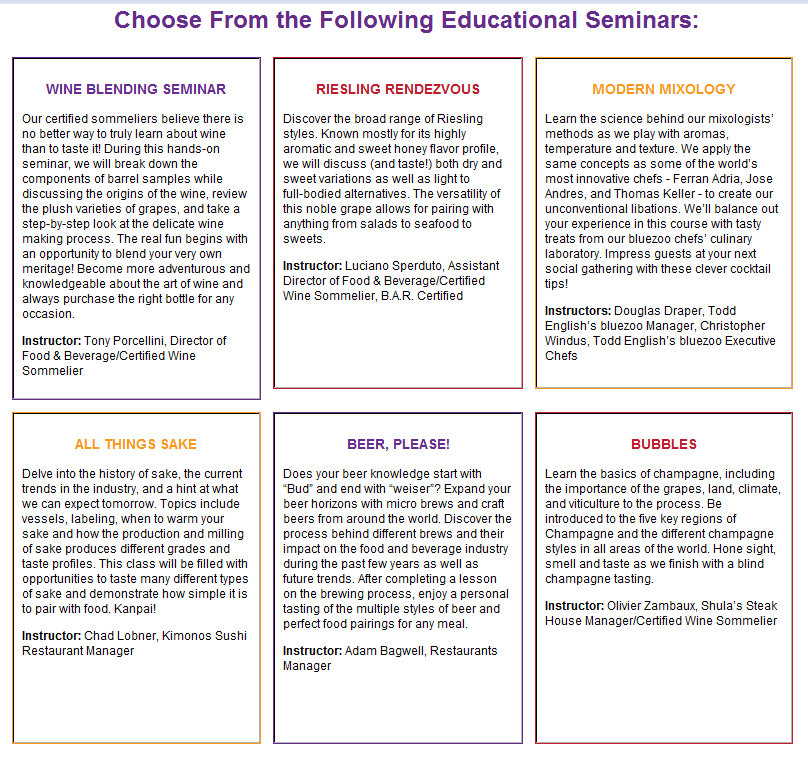 The Swan and Dolphin have complimented their first annual event with six exclusive seminars led by outstanding members of their food and beverage staff, including the executive chef of Todd English’s bluezoo and three Certified Wine Sommeliers. Purchasing an advance ticket for the event will gain you access into one seminar of your choice, but be sure to book early! These will sell out fast! To purchase your ticket and book your seminar, call 407-934-1609. Click the image below for a larger version.