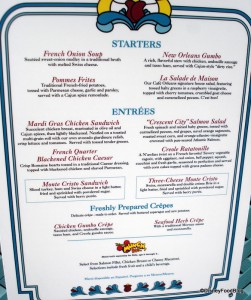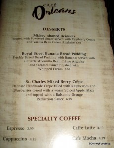 We have been to Cafe Orleans serveral times it is always wonderful, my DH & I were there for our Anniversary and I had the Onion soup, I must always have this, and the “Blackened chicken ceasar salad” it was good but nothing spectacular, My DH had the “Ratatouille”, he had to try it because of the movie, and loved it! He also had the gumbo and it was excellent. I always must save room for the “Mixed berry crepes” they are my favorite, the server who seen we had our Anniversary badges, brought out a complimentary order with two Mickey Beignets they were great, but we were already so full we only ate one. Everything there is wonderful and the service is exceptional! the outside dining and people watching is great also we got to watch the “Marde Gras” perfomance, we will be back!