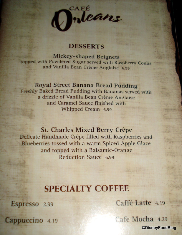 I really want to try those pommes frites, but I harbor a couple of fears about Cafe Orleans: (1) not much on the menu that will appeal to the rest of my family, especially the kids, who are picky and (2) we have lots of really good Cajun/Creole food here in Houston and I fear that the California/Disney version will be disappointing.