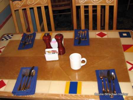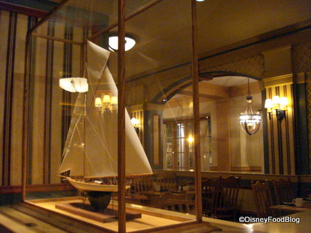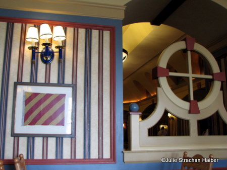 The Captain’s Grille is right off the lobby of the Yacht Club. The décor is consistent with the resort lobby, but uses lighter woods and an open floor plan. Tables are bordered with semaphore flag details like one might see on actual ships. A passerby can gaze in upon the diners through the openings (or portholes if you will) in the walls.