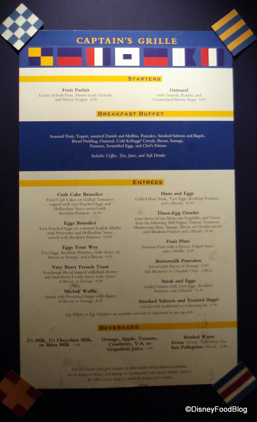 The service was fast and friendly, and the restaurant was able to accommodate walk ups. Beverages are served at the start of the meal (hot coffee or tea, juice, milk), and are freely refilled throughout your morning. I recommend the Captain’s Grille for a change of pace from your action packed mornings trying to snap photos of Mickey between trips to the buffet. When you want to sit and enjoy your breakfast and a quick service just won’t do, this place is delicious!