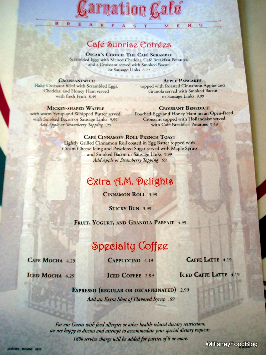 The Carnation Cafe looks like it has a wonderful breakfast menu to choose from! I think if I ended up going there I would get the Yogurt, as that’s my usual breakfast. Although, I still have yet to try a Mickey Waffle to date but my guess is that some of the buffet places are better to try them at.