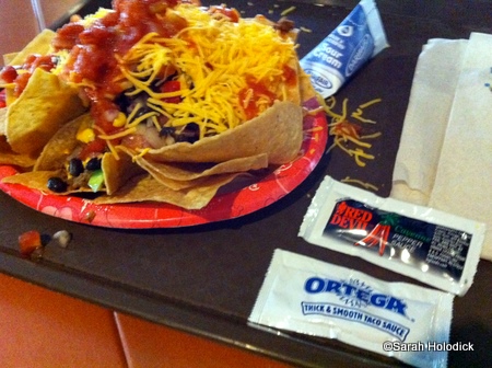 Alas, this one did not have the accommodation of more oozy, neon cheese, but it was sufficient considering the food being served: shredded lettuce, shredded cheese, and salsa. There were also packets of Red Devil Cayenne Pepper Sauce and Ortega Thick and Smooth Taco Sauce. I passed on the lettuce and just added additional cheese, tomatoes and salsa to my nachos.