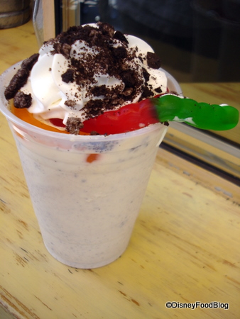 My husband chose the extra thick Vanilla “After Shake,” while I couldn’t help myself and had to go for the “Bug’s Land Sensation” Shaker o’ Mud (chocolate cookies blended into the shake followed by a gummy worm topping…).