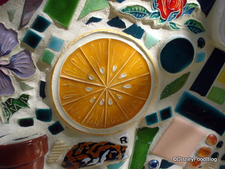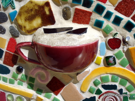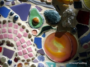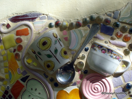 An eclectic array of broken and whole tiles, teacups, teaspoons, and more has been pressed into this wall in Disneyland Resort. Does anyone know where?