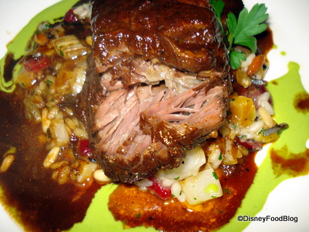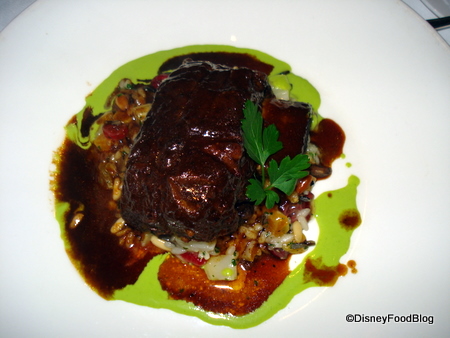 Moving on to more absolute gluttony, we ordered the Zinfandel Braised Angus Beef Short Rib with Risotto of Wild Rice, Pine Nuts and Dried Cranberries with English Pea Coulis AND the Grilled Angus Beef Filet Mignon with Hearty Oxtail Mushrooms Ragu and Mine Shaft Blue Cheese Butter.