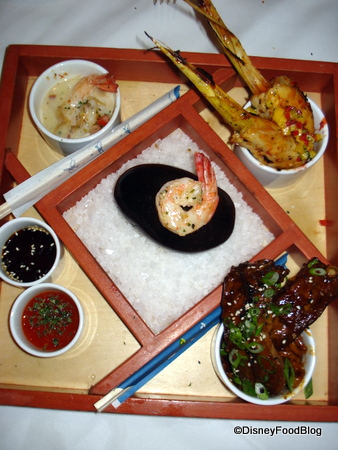 You’d think that would be enough for an appetizer, but on the suggestion of Sam Gennaway, we also ordered The Sizzling Beach Rock, described as A Combination Appetizer of Garlic Seared Shrimp, Soy Glazed Spare Ribs and Lemon Grass Chicken Skewers cooked on a Hot Beach Stone.