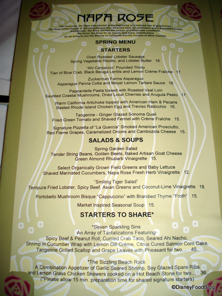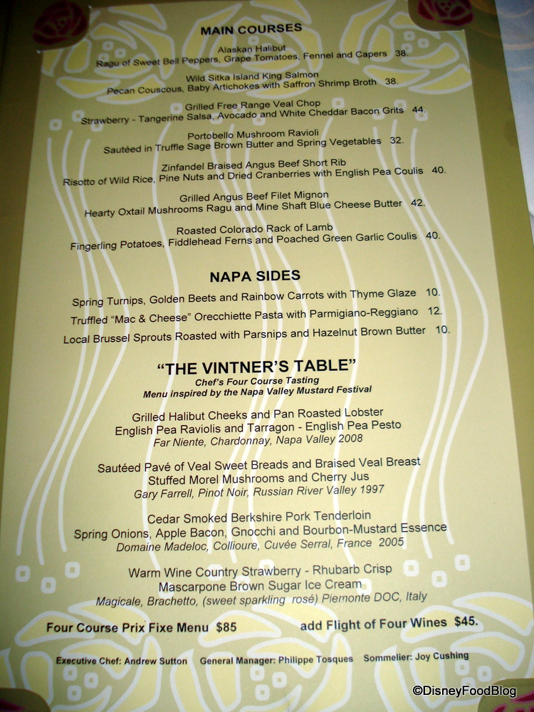 The menu at Napa Rose is an ever-changing, market-inspired California fest of wonderfulness. I liken it to California Grill in WDW, if I have to make a comparison. With the menu covering the standards of pasta, white and red meat, fish, and locally grown veggies, it is, of course, the art that makes it outstanding.