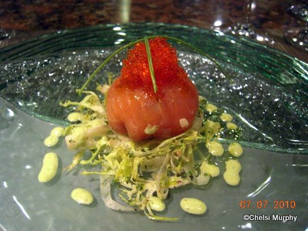 Next came the first course, a Crispy Tempura-Crusted Soft Shell Crab with Spring Radishes, Cucumber, shaved Lotus Root and two Fragrant Asian Sauces. This was served with Selbach-Oster Kabinett Riesling, Mosel ’08. I could have eaten this all night! I love soft shell crab and this looked like the Soft-Shell Mountain from Close Encounters of the 3rd Kind. It was amazing and super crispy. The Riesling was another perfect pairing, and I was surprised how much I loved this wine; again, slightly sweet and acidic to go with the fried crab.