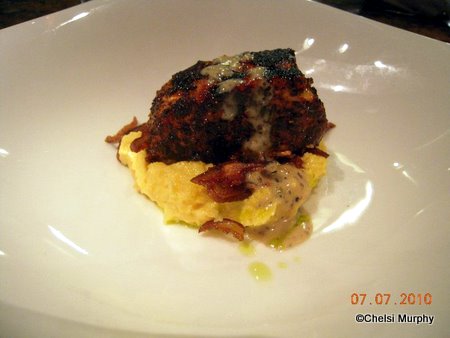 The second course was Porcini, Pepperberry and Wattleseed-crusted Bay of Fundy Salmon with truffled Preserved Lemon Butter Emulsion served with Francis Ford Coppola Votre Sante Pinot Noir, Sonoma Coast ’07. The Salmon was beautifully cooked and the preserved lemon butter was good enough to lick off the plate. Don’t worry – I refrained! 🙂 This was the only wine pairing of the night we were not thrilled with. There was nothing wrong with the wine, just not our personal favorite.
