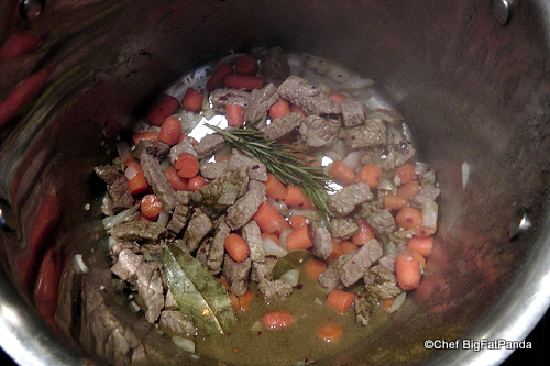 1. Sear sirloin cubes in a large stock pot in a small amount of olive oil, add the bay leaf.