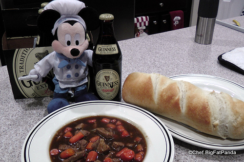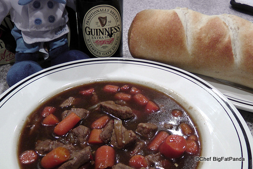 This is really hearty and tasty. The Guinness is definitely something I might actually add to my own stew in the future. I certainly missed my larger carrots and I really missed POTATOES! Oh Potatoes, where have you gone? So, I baked up some French Bread and dipped away.