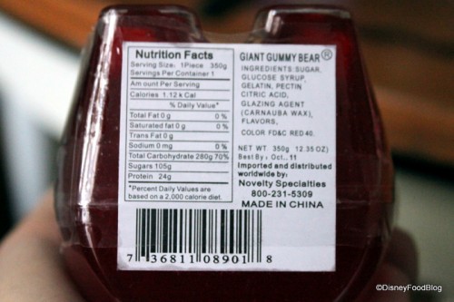 Overall, I’m pretty sure I don’t want another Giant Gummy Bear, but I can see why this might be the perfect “treat” to bring home to a favorite kiddo in your life — or a friend who’s a candy freak! It travels well, won’t cost you the farm, and really does taste quite good! If the bear comes home to your house, get a nice big knife and cut it up into pieces, put them in ziploc bags, and save them as individual gummy treats.